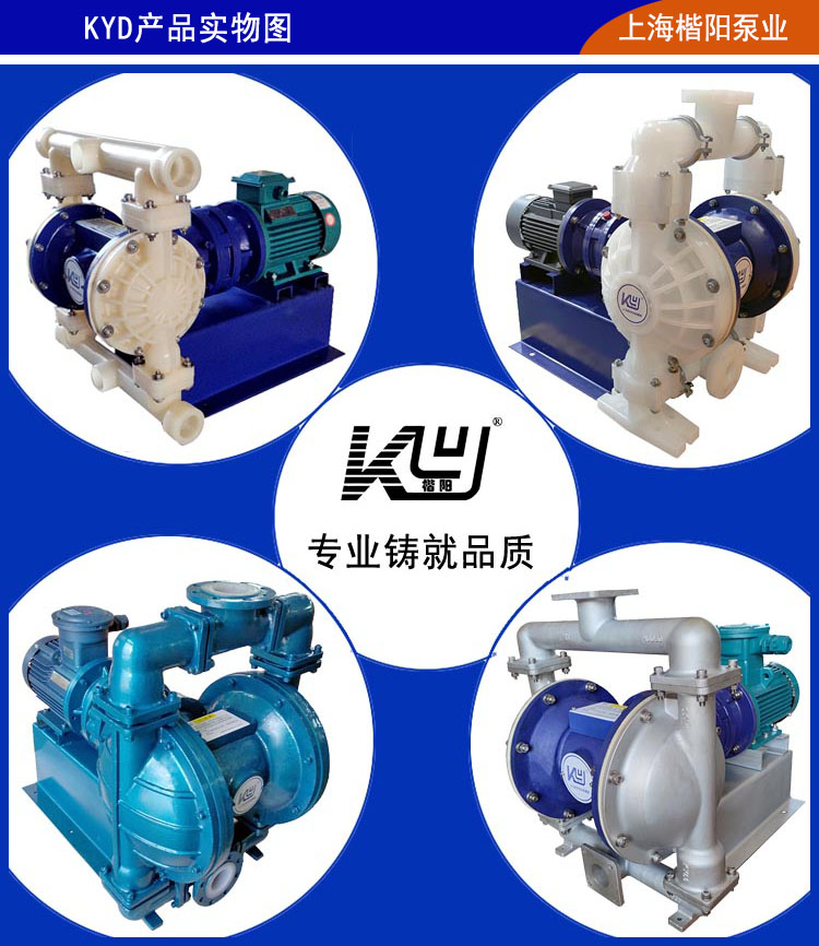KYD型電動隔膜泵是一種采用BLY擺線針輪減速機傳動動力的往復泵,上海楷陽電動隔膜泵廠家經過數十年的研發改進,生產出了具有國際水平的電動隔膜泵。其材質也取得了突破性的進展,上海楷陽電動隔膜泵廠家生產的KYD型電動隔膜泵主要材質有304不銹鋼隔膜泵、316L不銹鋼隔膜泵、電動鑄鐵隔膜泵、電動鋁合金隔膜泵、工程塑料(增強聚丙烯)電動隔膜泵、氟塑料(聚偏氟乙烯)電動隔膜泵和耐腐蝕抗壓性能超強的鋼襯氟電動隔膜泵等。