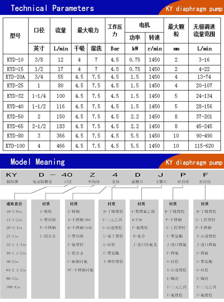 KYD電動氟塑料隔膜泵的源動力是由西門子貝德電機(jī)給予,電機(jī)通過減速機(jī)帶動泵體左右兩端連桿軸上的隔膜片左右往復(fù)運(yùn)動。在左右兩個泵腔里裝有上下四個單項球閥,隔膜片的左右運(yùn)動使泵腔內(nèi)的容積產(chǎn)生有規(guī)律的改變。迫使四個單項球閥交替的開啟和關(guān)閉,從而將液體吸入和排出產(chǎn)生流體。隔膜泵電動型是上海楷陽電動隔膜泵廠家開發(fā)的新一代耐腐蝕隔膜泵,具有質(zhì)量可靠使用壽命長、噪音底、震動小、耐腐蝕、做工精細(xì)等六大優(yōu)點,是目前國內(nèi)最新穎的一種電動氟塑料隔膜泵。上海楷陽電動耐腐蝕隔膜泵材質(zhì)齊全,膜片、球、球座采用耐腐蝕強(qiáng)彈性好的 F46(聚全氟乙丙烯FEP或者 F46,是四氟乙烯和六氟丙烯的共聚物)材質(zhì),對于各種腐蝕性液體,帶顆粒的液體,高粘度、易揮發(fā)、易燃、劇毒的液體,均能予以抽 光吸盡。其性能參數(shù)與聯(lián)邦德國WLLDENPVMPS、美國的MARIOWPUMPS相近。