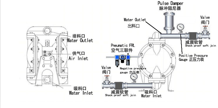 氣動隔膜泵的安裝有多種方法,主要以安全和保護、方便維修為主;但是空氣三聯件和軟接是氣動隔膜泵必備的附件??諝馊摷淖饔弥饕^濾氣源雜質,避免雜質進入泵內損壞泵體氣動馬達;另外可以保護泵不受高壓或者不穩定氣壓產生的損壞。隔膜泵工作時具有較大的后座力,泵體和管道都有一定的抖動,所以增加減震軟接可以有效減小這種后座力,從而延長隔膜泵和管道的整體壽命。