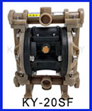 KY-20SS工程塑料氣動隔膜泵又叫做PP氣動隔膜泵,是上??柋脴I根據廣大客戶實際使用情況需求而研發生產的.由于它的獨特材質注定了它的優良特性:首先相對于金屬氣動隔膜泵而言它的重量可以減輕一半,極大的加強了隔膜泵的移動性能;工程塑料氣動隔膜泵對于含有金屬介質液體的輸送沒有任何影響,并且對于一些酸性液體由更好的耐腐蝕性能,對于一些醫用單位、化工單位和金礦單位是一種絕佳的水泵選擇;