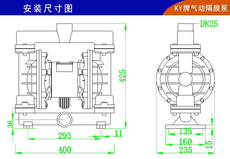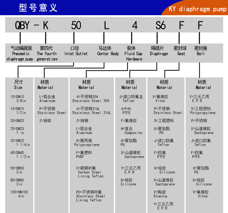 QBY-K25LL鋁合金氣動隔膜泵是第四代氣動隔膜泵,它以壓縮空氣為動力;左右兩個泵腔分別裝有彈性隔膜,因此又稱氣動雙隔膜泵。當壓縮氣體進入中間馬達體,馬達體會將壓縮氣體壓入隔膜泵其中一腔從而推動隔膜片運動擠壓液體流出,同時隔膜泵的另一腔因為被拉出而吸入液體。當隔膜片到達終點,配氣閥機構自動將壓縮空氣引入泵腔另一端,推動隔膜片朝相反方向運動,從而使雙隔膜片在泵體的兩個腔做往復運動,抽動液體流動。上海楷陽為方便客戶使用,第四代QBY-K25氣動隔膜泵已經研發了十余種材質生產:鑄鐵氣動雙隔膜泵、鋁合金氣動隔膜泵、不銹鋼304氣動雙隔膜泵、不銹鋼316L氣動雙隔膜泵、工程塑料(增強聚丙烯)氣動隔膜泵、氟塑料(PVDF)氣動隔膜泵和耐腐蝕抗壓性能超強的鋼襯氟氣動雙隔膜泵等。