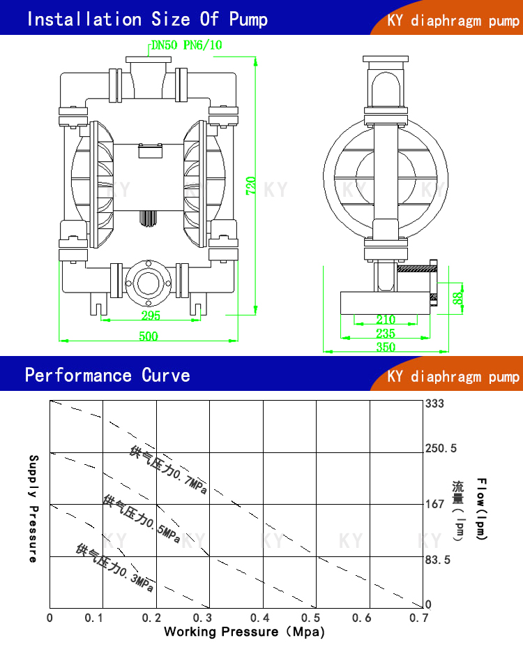 7、第四代qby氣動隔膜泵不需灌引水,吸程高達7米,揚程達70米,出口壓力≧7bar;通過性能好,允許通過最大顆粒直徑達10毫米。