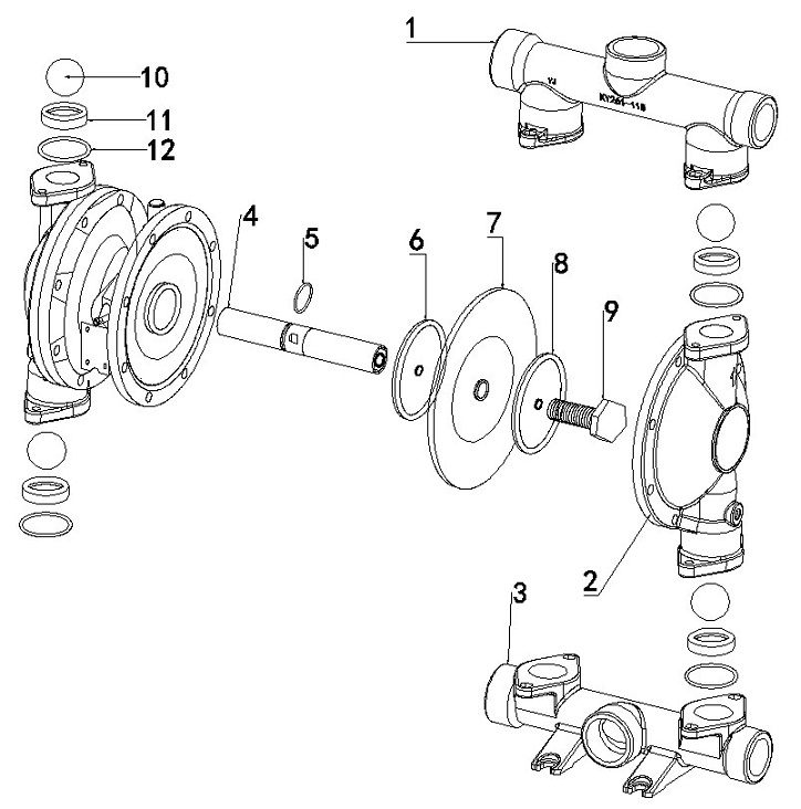 第一種氣動隔膜泵漏氣現象是由于馬達端的氣源進入液體端造成的;屬于容積泵,馬達端通過馬達體進氣并左右換氣,通過左右隔膜片推動液體端使其容積大小變化,而產生流體。馬達端和液體端靠隔膜片和隔膜壓板隔離開來,漏氣說明隔膜片破裂或者壓板松動造成。此時需要檢查隔膜片和內外壓板,由于隔膜片是易損件,不在質保范圍內(除楷陽KY261系列產品);所以楷陽泵業建議用戶購買隔膜泵時請加購隔膜片、密封球和密封座,用以備用。檢查隔膜片和內外壓板請參考下圖: