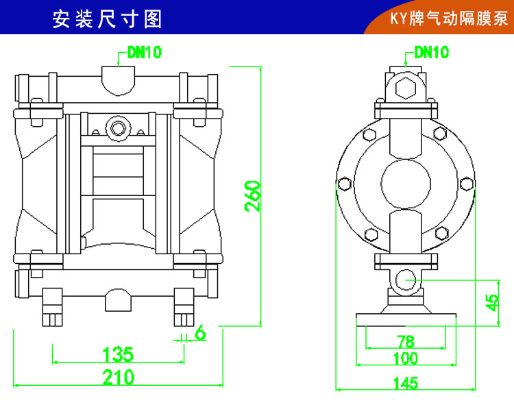 2、楷陽KY-10SZ鑄鐵氣動隔膜泵對于抽油類介質有獨特的耐腐優勢,價格也相對便宜;由于氣動隔膜泵工作原理的獨特性,也就注定了他無與倫比的安全性能和安靜性能。